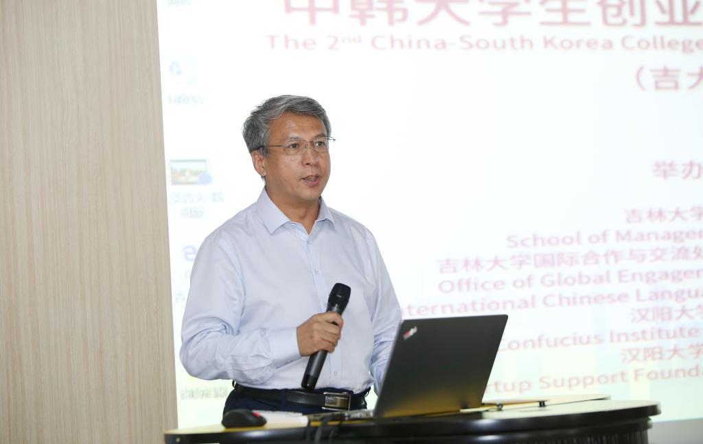 在创新创业教育和大赛中取得的成绩,并表示非常高兴能参与本次赛事的举办,并预祝各组参赛选手取得优异成绩。致辞后李北伟院长和汉阳大学Bae Tae Jun教授互赠了礼物。