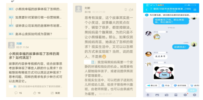 为了克服以上两个难点,刘娜老师对线上教学从两个方面进行了准备。一是重新规划课堂内容的体系设计,在理论讲授前,大大加重了现实案例铺垫和逻辑性引导,让学生能顺利的从松散生活逐步进入深度思考;第二,提前公开课程精彩环节,发布趣味性讨论,并以00后所熟悉的方式开展群内互动,完成课前引流。