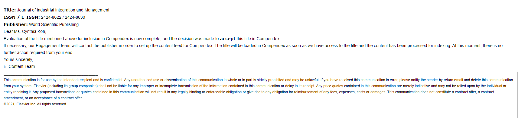 英文期刊《产业集成与管理:创新与创业》(JIIM:I&E)已被批准进入EI Compendex 检索。