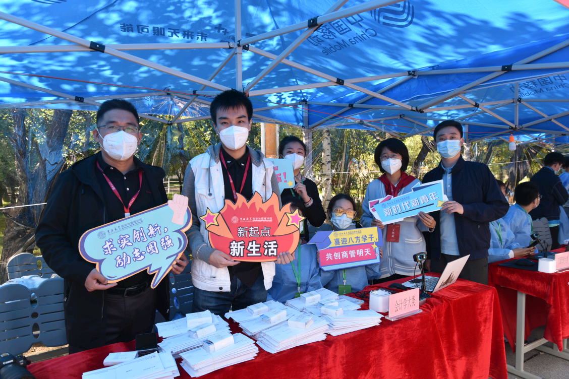 党委副书记兼副院长李帅、新生辅导员李毓、贾奇达,学生工作办公室丁越、刘天目、陈卓、刘翔宇与迎新志愿者们已经早早地来到迎新现场,将一箱箱迎新物资搬到迎新帐篷并且摆放整齐,以文明、饱满的精神面貌准备迎接来自祖国各地的新同学。