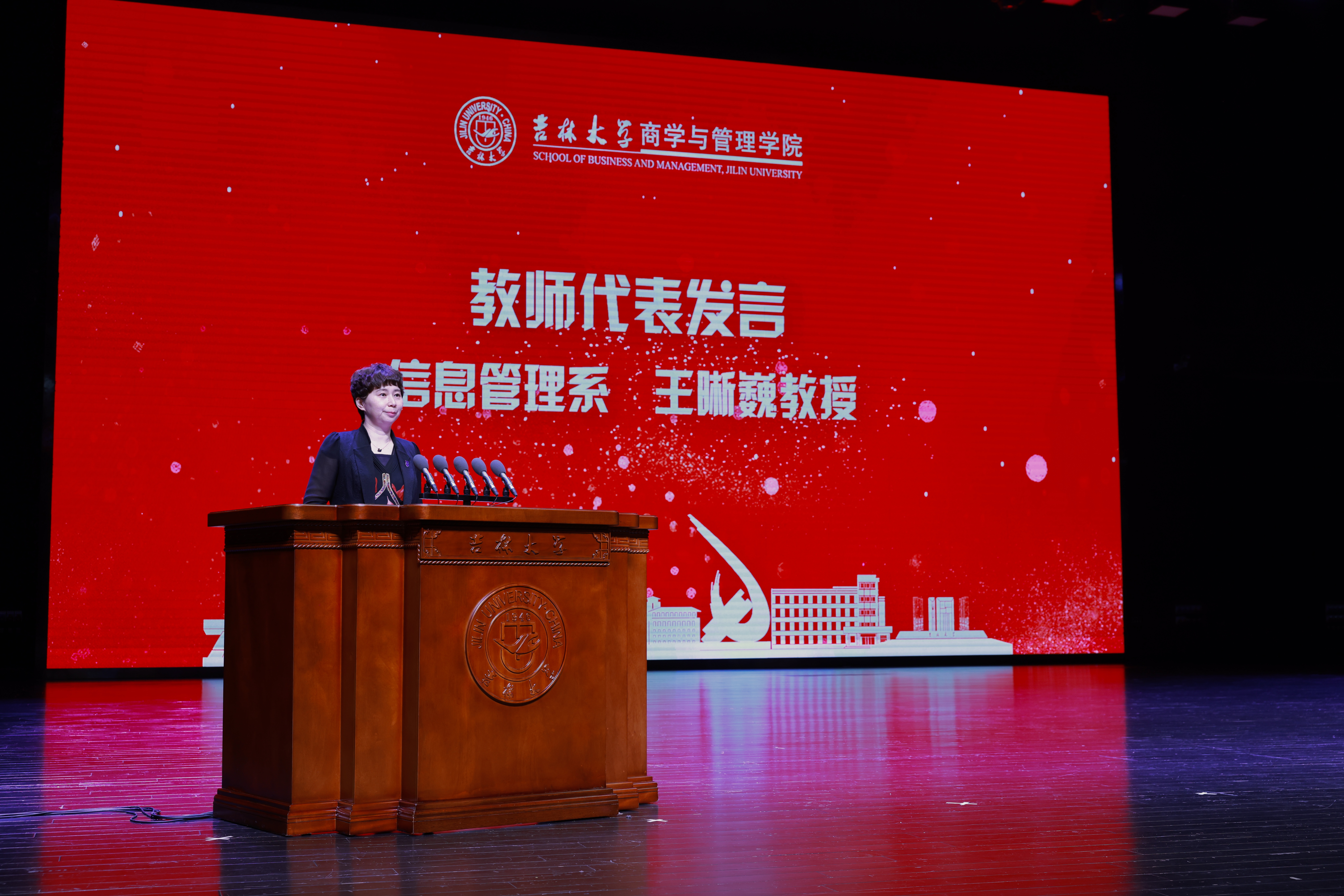 信息管理系王晰巍教授,作为教师代表进行了发言。王晰巍教授在发言中对毕业生们送上祝福:第一,希望同学们心有梦想,能勇立时代潮头。第二,希望同学们追求优秀,把勤奋作为习惯。第三,希望同学们终身学习,提升人生格局。最后,王晰巍教授祝愿成人抖音
