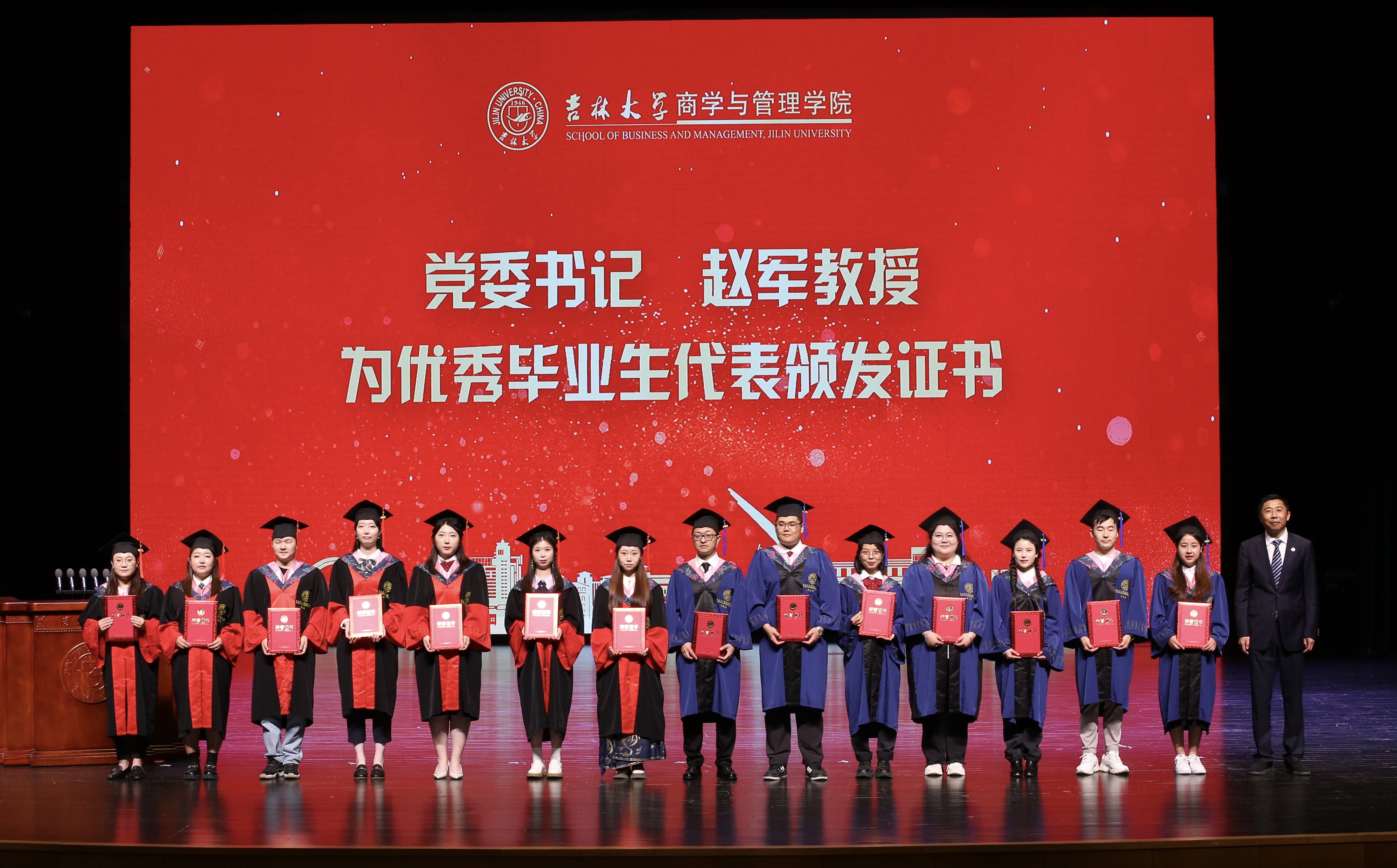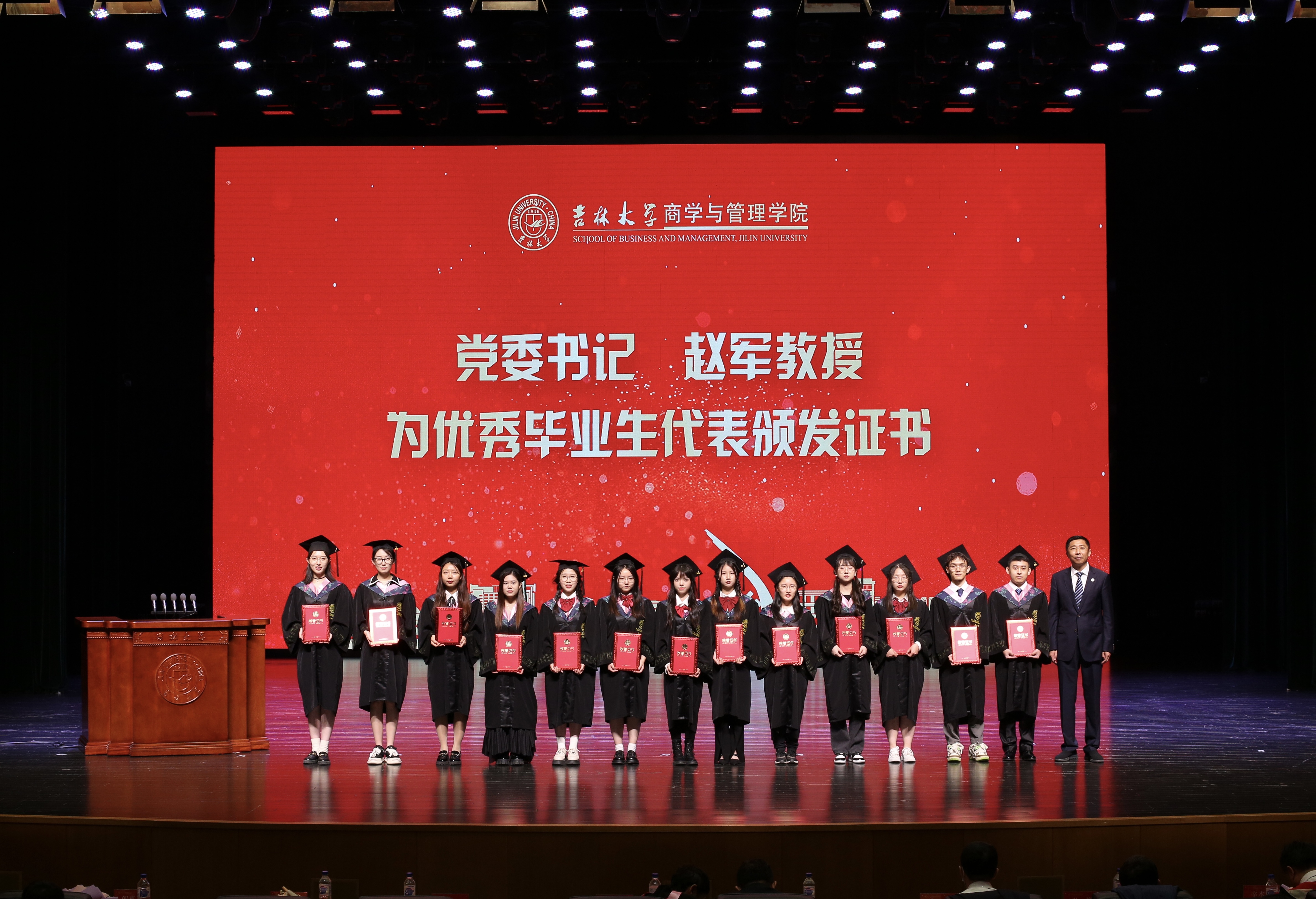 党委书记赵军教授为优秀毕业生代表颁发证书。这是一份荣耀,更是一份力量,是商管师生的精神共勉,更是传承一份责任、一份担当,愿同学们在前行的道路上继续笃行慎思,求真务实,坚持深耕不辍,必有未来可期!