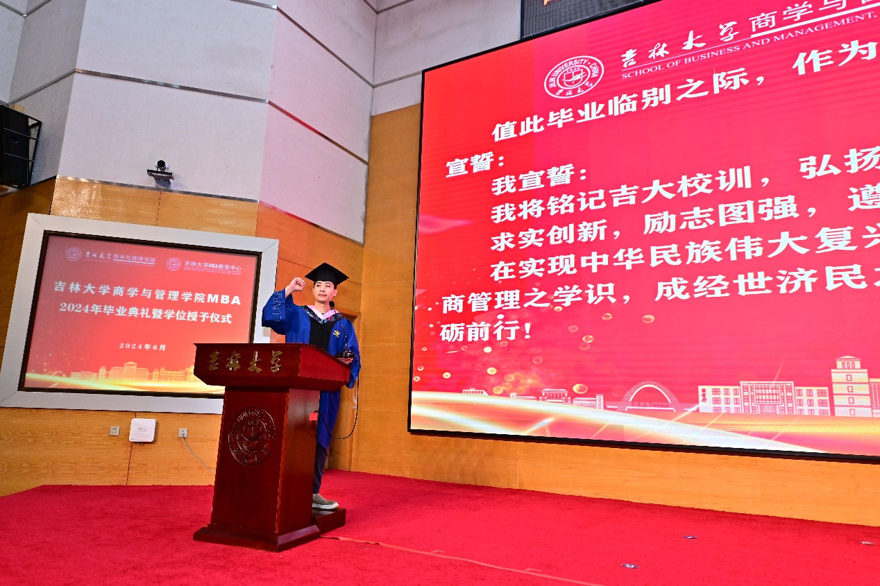 毕业生代表白柯萌致毕业感言,MBA校友荣小春为毕业生送上祝福。
