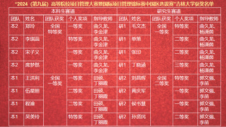 参加第九届全国高等院校项目管理大赛,在团体赛中,荣获本科生组特等奖和一等奖,研究生组一等奖和二等奖;在个人赛中,荣获本科生组特等奖2项、一等奖4项、二等奖2项,研究生组特等奖2项、一等奖2项、二等奖3项、三等奖1项;共有13名参赛学生通过比赛获得国际项目管理专业资质IPMP (International Project Manager Professional)D级证书资格;曲久龙、丁丽霞、田硕、李金津、郭文强、杨潇茵和李苗等7名老师获得优秀指导教师奖。