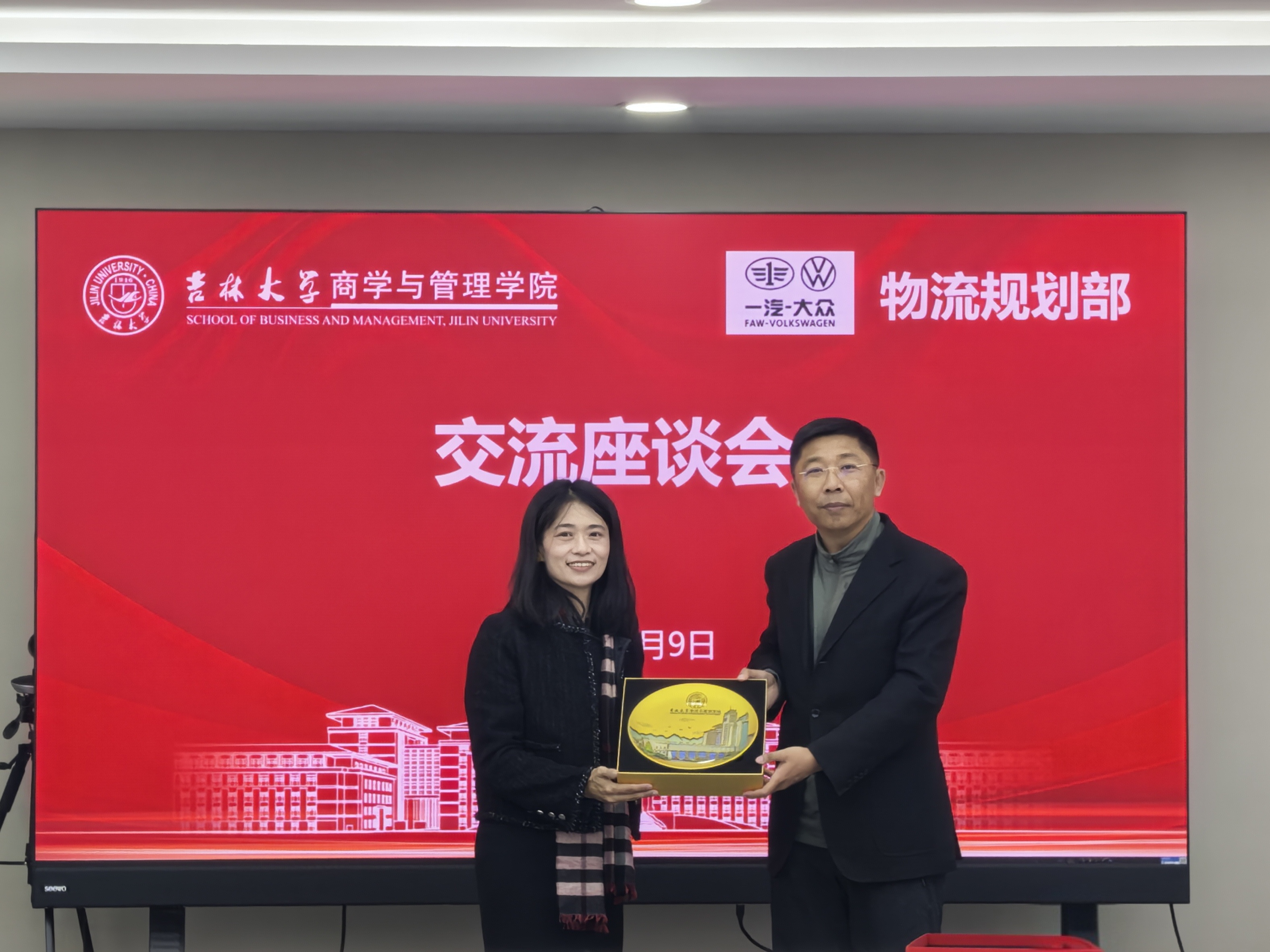 一汽-大众汽车有限公司物流规划部部长兼党总支委员陈众源在座谈会上介绍了一汽-大众汽车有限公司生产管理部的基本情况。陈部长从一汽-大众企业概况、组织架构、生产管理部人员构成、业务简介、物流与供应链规划及管理方面全方位展示了一汽-大众汽车有限公司在物流领域的实际业务运营、智慧化探索及相关成就,并表示企业未来智慧物流发展需要高校援以专业的行业知识和开阔的国际化视野。希望以此次党建共建为契机,双方深入交流学习、共享工作资源,建立长期合作机制,定期开展活动,实现优势互补、资源共享、共建共荣的发展新局面。