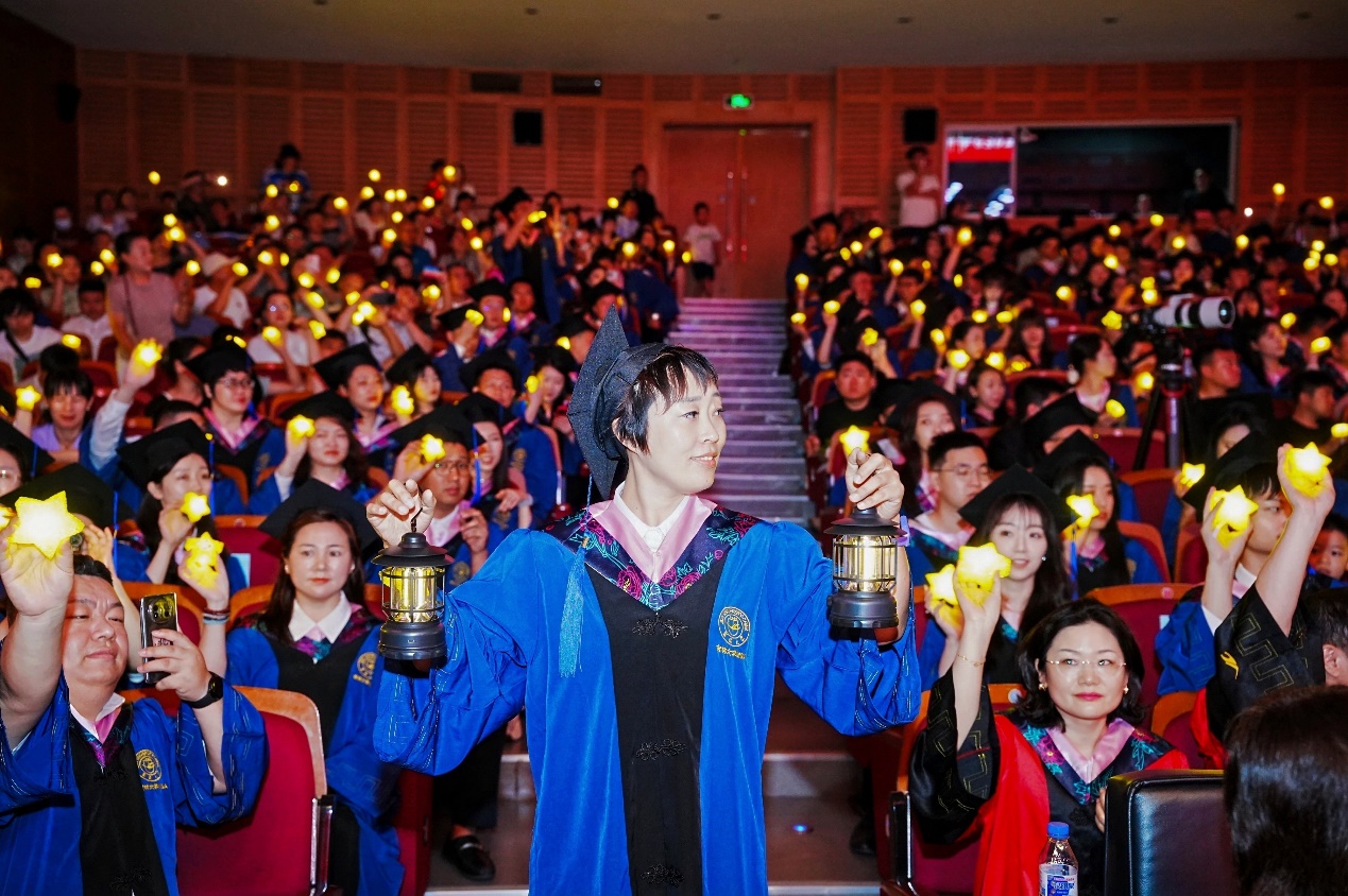 精神传承的火炬引领入场,毕业生代表温宏娜手捧“心灵之灯”紧随其后。当火炬在舞台交汇,全场学子点亮腕间星星灯,霎时星河璀璨。