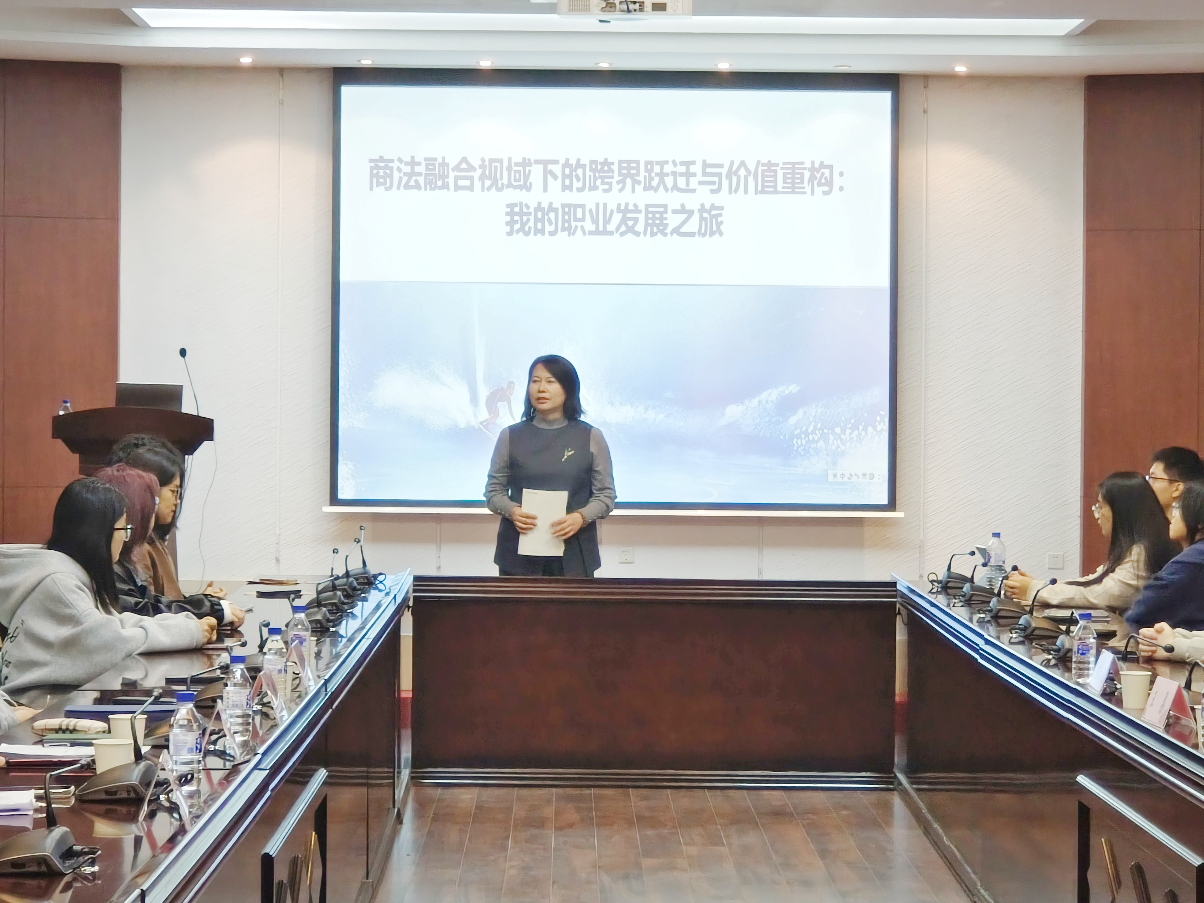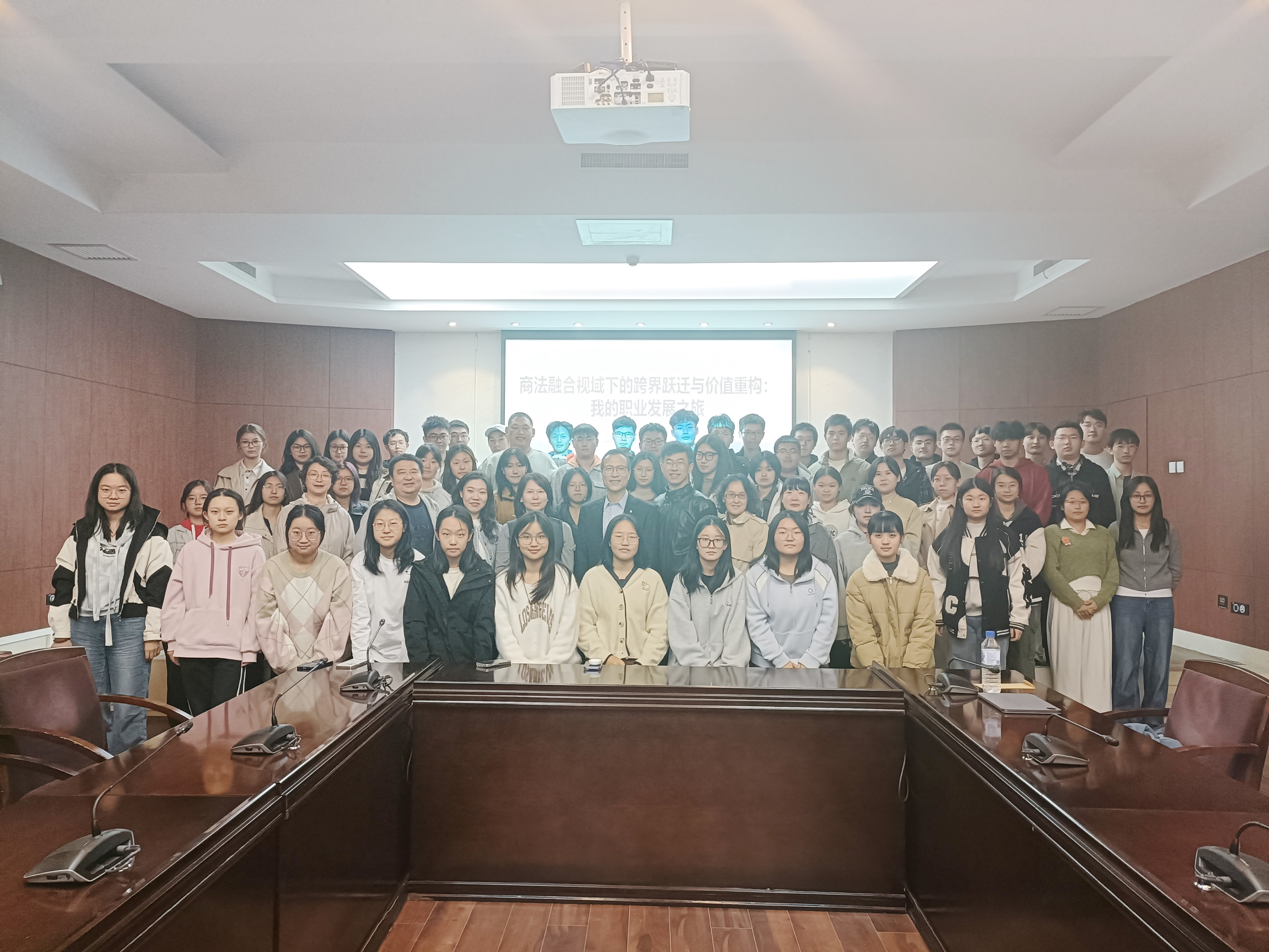对王老师的到来表示热烈的欢迎。随后,王勇老师结合个人职业发展历程,围绕大学求学、公务员、律师及教育创业者四个阶段展开分享,系统阐述了在商法融合背景下的实践思考与成长感悟。他从工作与学习双重视角出发,为在场同学们提出以下核心建议:在专业学习上,应拓宽知识边界,注重培养自学能力与主动担当的精神;在学习方法上,王老师将学习概括为十字经验,即“读书、思考、交流、实践、自学”,强调学习应超越应试,实现内化于心、外化于行;在职业规划上,王老师倡导“将个人内驱力与社会普遍需求相结合”,理性选择行业赛道,应不断向内探索,明晰真实需求,以内在动力驱动行为选择,持续学习与思考;在人生决策上,应以未来期望为导向,避免陷入线性思维的陷阱;在认知构建上,王老师强调个人认知的突破有赖于持续且主动的自我训练,学生应有意识地与高认知人士交流、刻意练习写作能力,在思想碰撞中汲取智慧,通过系统性的文字输出梳理思想。