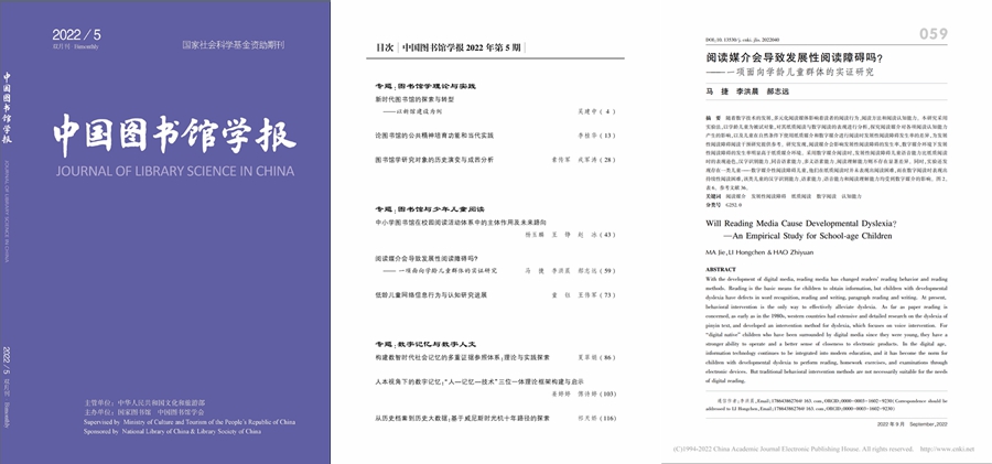 马捷教授等在《中国图书馆学报》2022年第5期发表题为《阅读媒介会导致发展性阅读障碍吗? ——一项面向学龄儿童群体的实证研究》文章。该文聚焦新媒体时代少年儿童阅读推广服务,通过实证研究探索阅读媒介与发展性阅读障碍之间的关系。