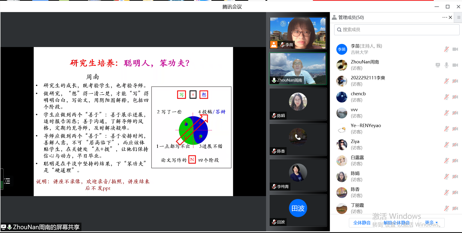 近年来,周教授致力于用《道德经》来诠释现代品牌营销和人生之道,由北京大学出版社先后出版《要钱还是要命:<道德经>的启示》(2012)、《佛光山的星巴克:<道德经>的启示》(2015)、《登山观海:146位管理学研究者的求索心路》( 2016)、《学问人生:<道德经>的启示》(2018)、《千山万水:<道德经>的启示》(2020)等随笔集。在本次报告中,周教授结合自身以及数位国内知名教师的经验,讲述培养研究生的方法和技巧,分析博士生的心理状态并分享自己的育人心得。最后,周教授从阴阳的视角将研究生作学文的过程分为不同的阶段,提出学生和导师在合作的过程中要分别做到两个善于:学生要善于展示和报告、善于沟通;导师要做到善于安排时间、善解人意。