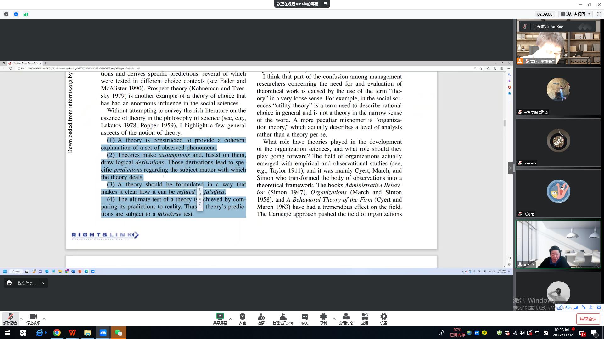 第二场讲座题目为“Power”。夏教授介绍了理论的两种表达方式:即数学语言、讲故事,以及理论的三个层次、四个严谨的方面。理论是对观察到的现象的因果关系的解释。理论需要 Assumption、Deviation和Prediction。如果写文章,最可能做到的就是去“攻击”其他文章的 assumption。夏老师以自己的文章为例讲解了如何针对其他论文的假设进行“攻击”写作论文,如stakeholder signal,并作为文章的贡献。另一篇文章是 structural holes 与 power、信任结合的例子。在美国,Power会使得员工得到提拔,但在中国却是一个负的结果。同样的研究内容,但在不同国家,结果是不一样的。原因在于 assumption不一样。最后,老师和同学们针对讲座内容提出了一个倒“U型”与线性调节的问题,夏老师给予了耐心的解答和详细的讲解。本次讲座极大地开阔了同学们的科研视野,得到了在场师生的一致好评。