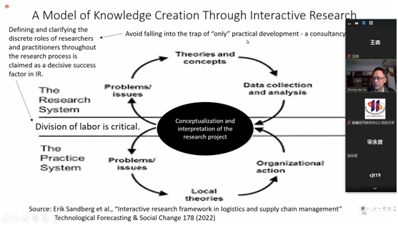 苏教授以自己所做的一篇研究Logistics innovation process revisited: insights from a hospital case study为例,详细介绍了该行动研究的起源、与产业合作的契机、开展实践行动的过程、以及与理论对话形成论文的全过程。该研究起源于对在职研究生毕业论文的指导,在两年的实践中,苏老师结合学生所在的医院存在的物流问题进行创新实践,这个过程是以物流创新理论为指导,并在应用中实现了对该理论的发展,最终论文发表在物流与供应链领域的重要期刊上,并获得了当年的最佳论文。