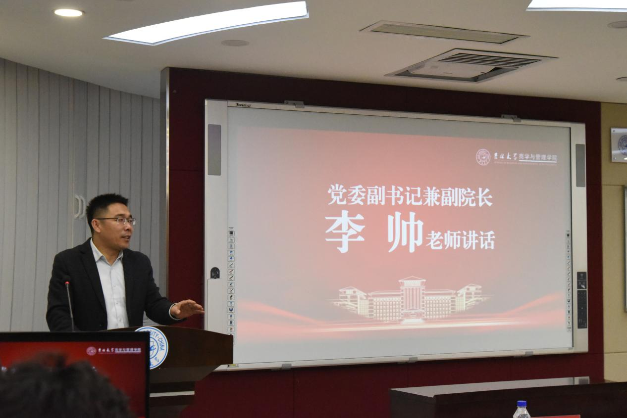 随后,党委副书记兼副院长李帅老师讲话。李帅老师以瑞雪兆丰年为引,结合自身的成长、工作经历,鼓励同学们脚踏实地,读万卷书,行万里路。随后,李帅老师寄语学生干部三点希望:一是希望同学们心有追求,胸怀梦想,将个人理想融入国家的发展伟大的进程中,成为祖国发展的中坚力量;二是希望同学们不骛于虚声,脚踏实地,天上不会掉馅饼,任何成功,都来自于持之以恒的努力;三是希望同学们肩上扛责任,勇于担当。首先是对自己的责任,每一个孩子都承载着家庭的希望,承载着民族的未来。同学们应端正学习态度,相信知识改变命运。其次是对集体的责任,每一个人都是集体的一份子,都有着团结集体,共同进步的使命担当。最后,也是最重要的,是家国责任。“故今日之责任,不在他人,而全在我少年”,希望同学们铭记历史,用智慧和力量为国家发展做出贡献。