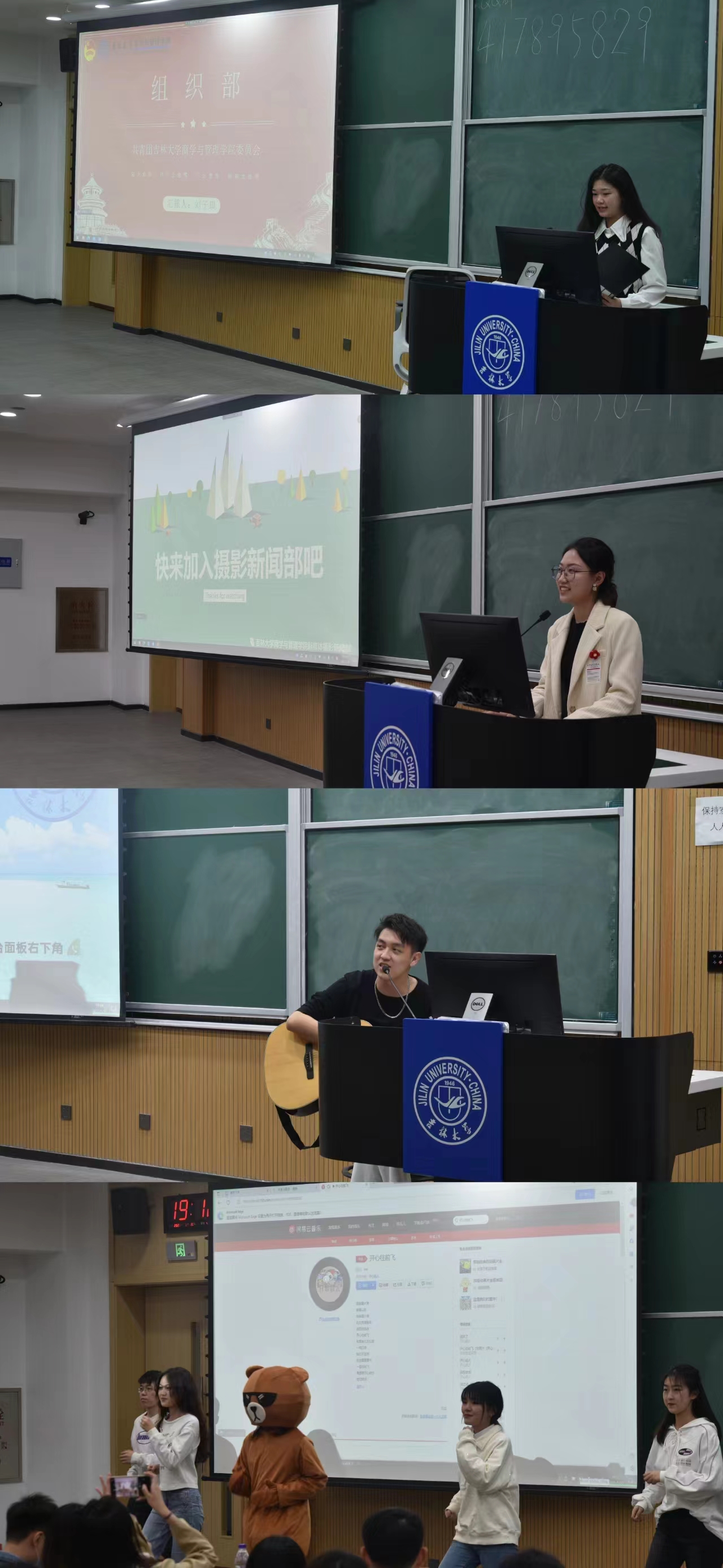 接下来各个组织部门的代表纷纷介绍了自己的组织架构、活动范围和招新要求,从先进青年群众性组织的团委到联系广大同学桥梁和纽带的学生会;从服务宿舍公寓学生生活的管委会到学生媒体运作的新媒体,介绍异彩纷呈。期间还穿插着活动表演,有歌舞、吉他、情景剧,赢得同学们阵阵掌声。