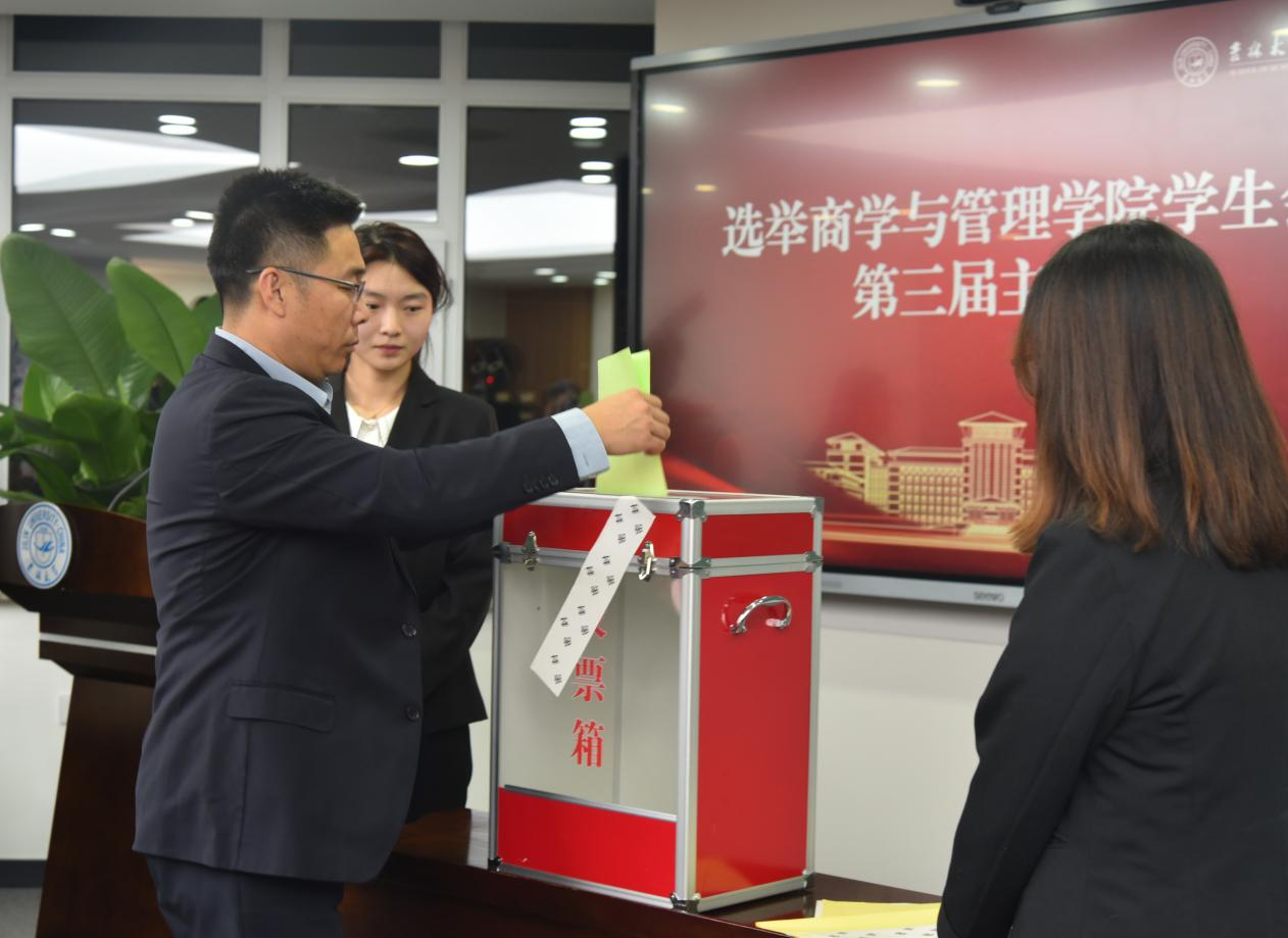 第二届学生会主席团成员柏申苏代表第二届学生会做以《弦歌不辍担初心使命,奋楫扬帆谱商管篇章》为题的工作报告,介绍了学生会在过去一年的卓然成效和未来工作规划。接着,大会听取并表决通过了学生会工作报告、学生组织绩效考核方案、总监票员、监票员、总计票员、计票员名单和学生会第三届主席团候选人名单。