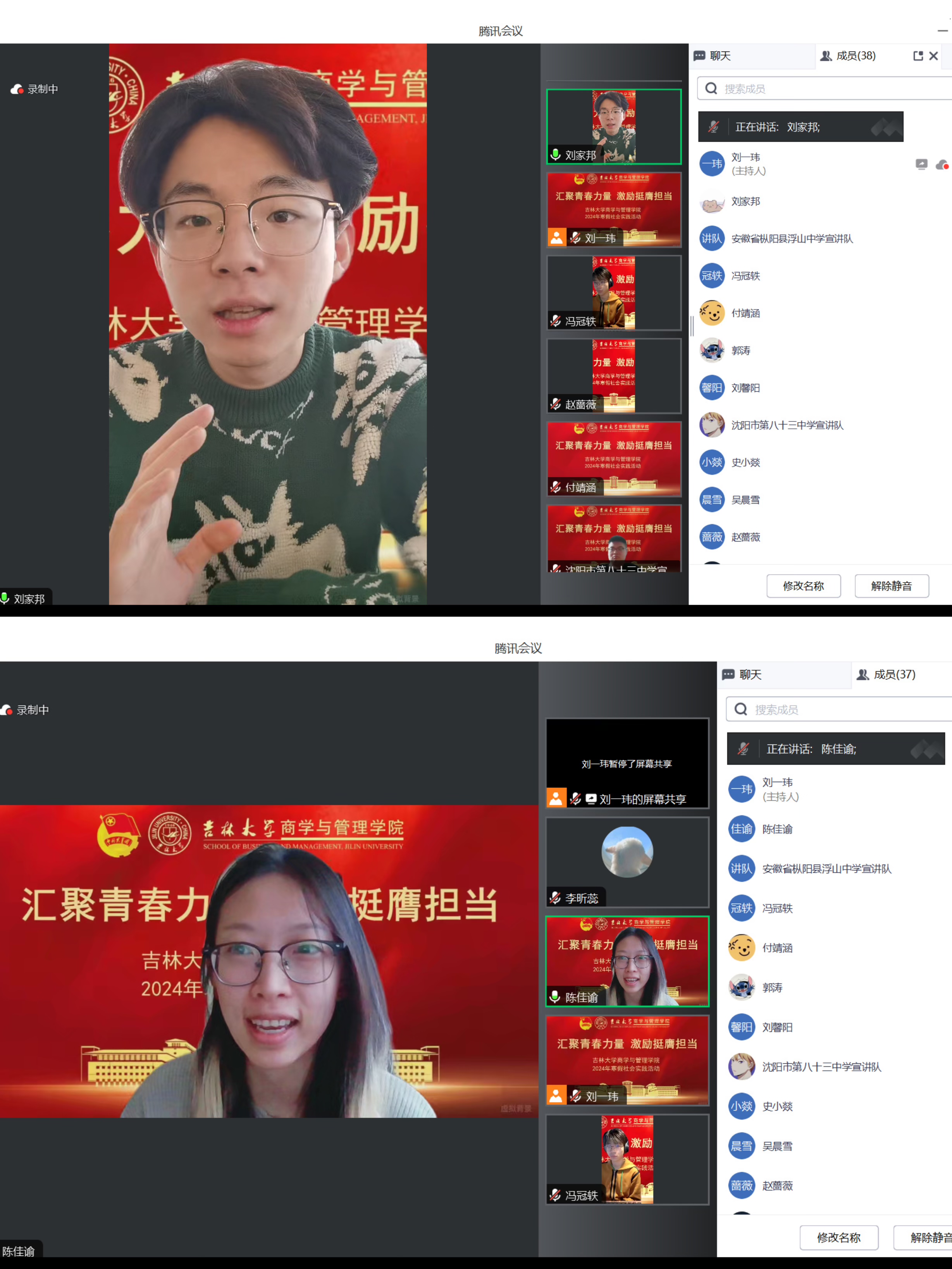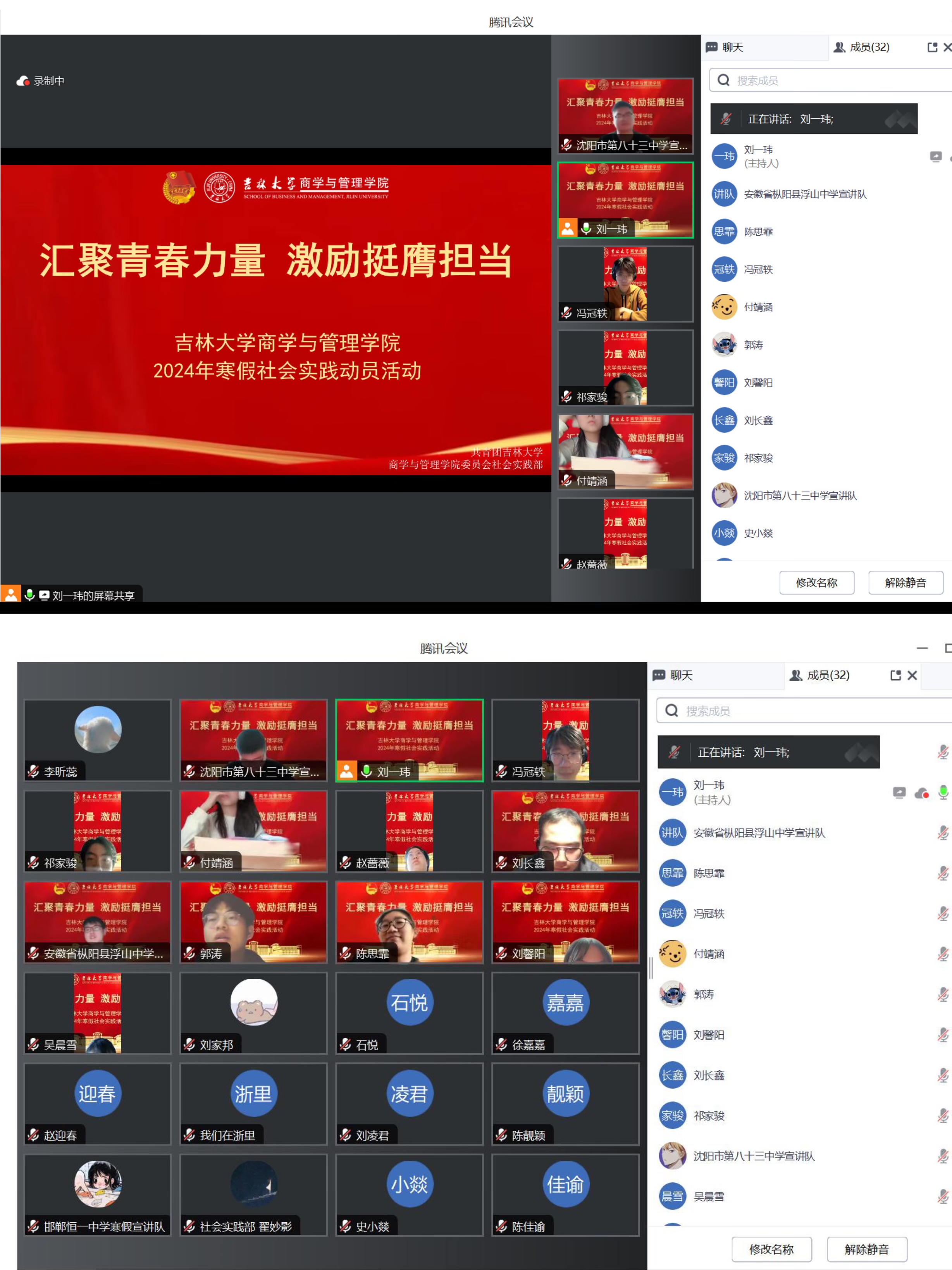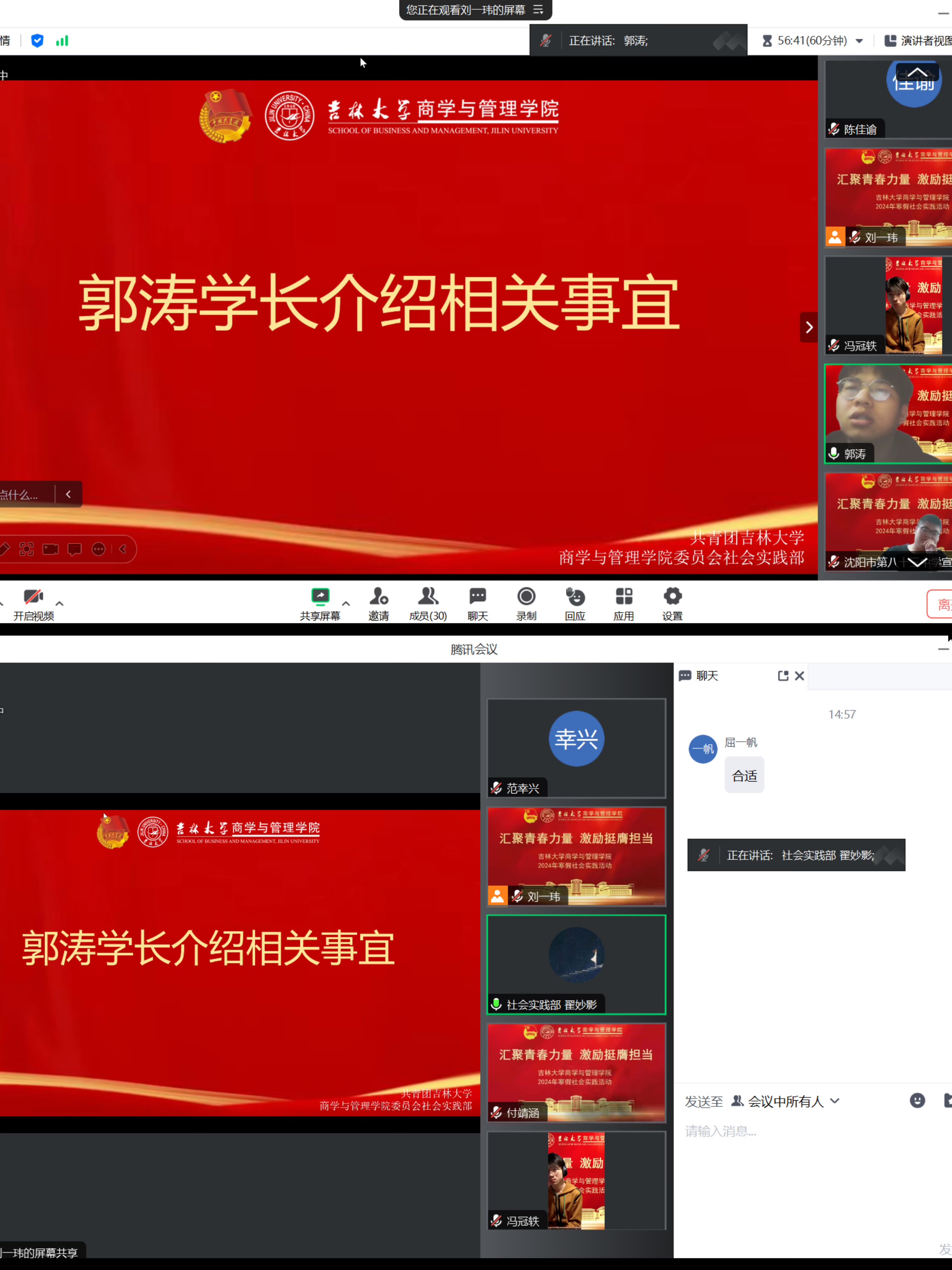2024年寒假实践活动动员大会,院团委书记刘天目老师、团学组织干部郭涛、翟妙影、刘家邦和陈佳瑜参与会议。