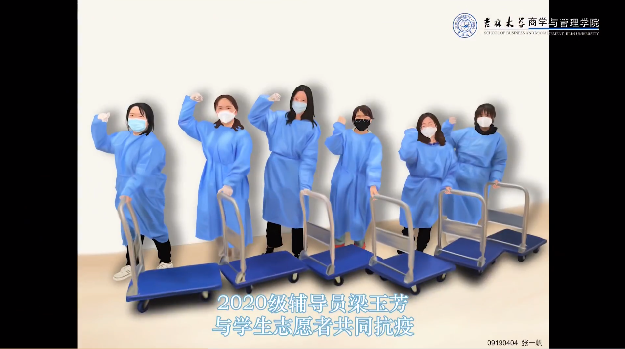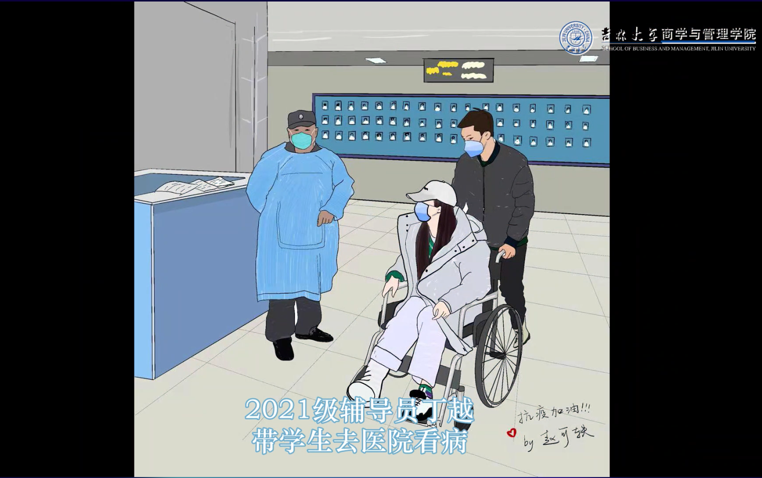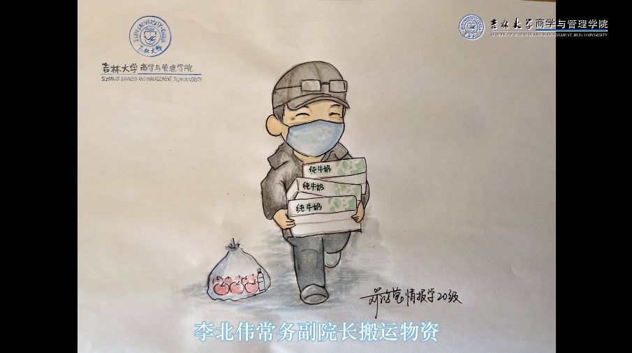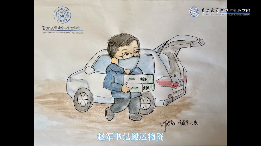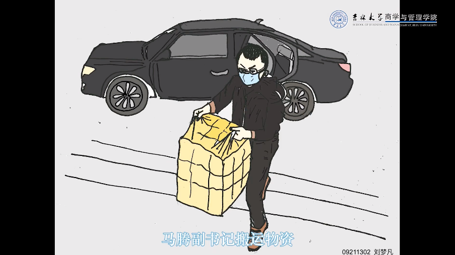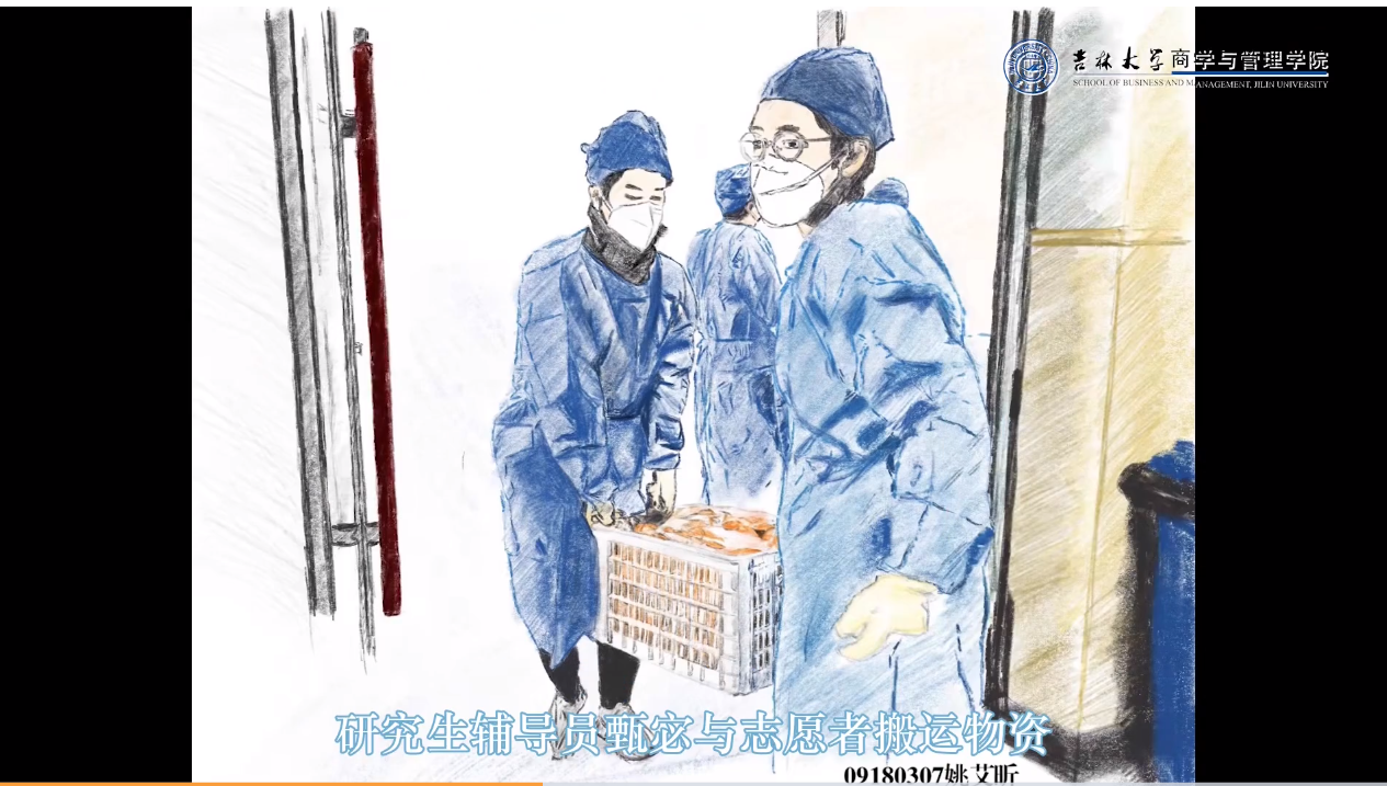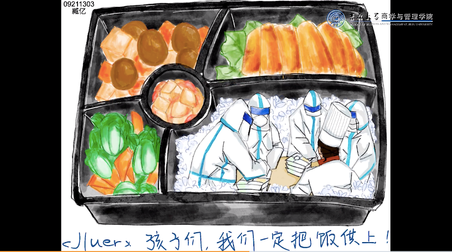 上下一心抗疫、振奋人心的情景,包括赵军书记、李北伟常务副院长、马腾副书记、李帅副书记、各位研究生与本科生辅导员和学生志愿者群体驻校抗疫、搬运物资等真实场景。此外还包括了数幅自由创作的艺术作品,一句“我们一定会把饭供上”感人心脾,一句“谢谢辛苦了”的标语温暖“大白”的心;一句“疫情特殊期间我得照顾好他们”热泪盈眶……画展整体风格主要采用令人身心愉悦的轻松漫画形式,深深地表达出同学们对医护人员、工作人员、驻校抗疫老师以及学生志愿者们无私奉献的感谢和敬意。最终,画展以小视频形式在微信视频号发布,受到了大家的一致好评与热烈喜爱,获得了广泛的关注与转发,具有一定的院内外、校内外影响力。