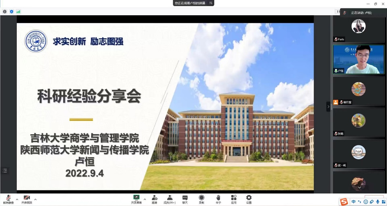 会议开始,裴月莹老师首先向大家简要介绍了卢恒学长,并对卢恒学长的到来表示热烈欢迎。随后卢恒学长开始分享,以自身硕博连读的经历为例子,讲述了自己如何在学术业绩成果和学生干部中相平衡。其次卢恒学长从三个视角分享自己的科研经验,分别是为什么写论文、论文是写出来的么以及如何撰写论文初稿与选择投稿期刊,其中重点讲述了如何撰写论文初稿以及如何将论文投稿。