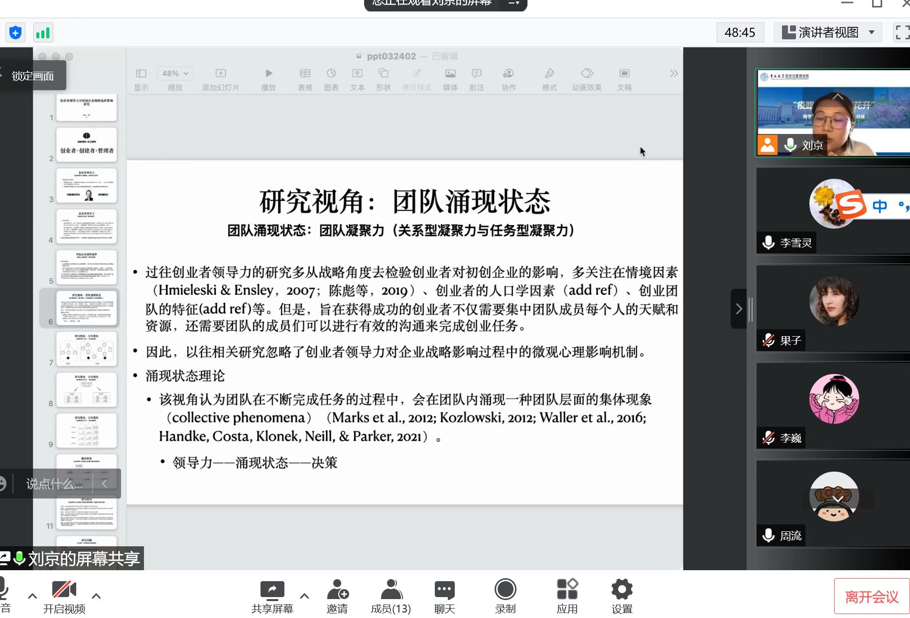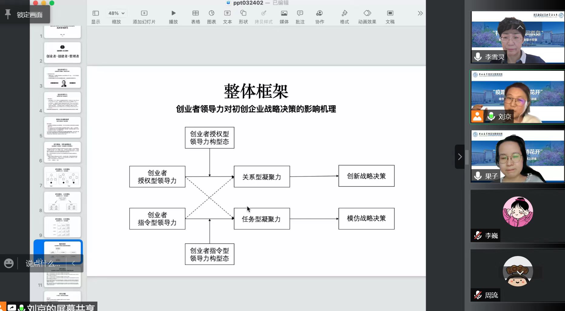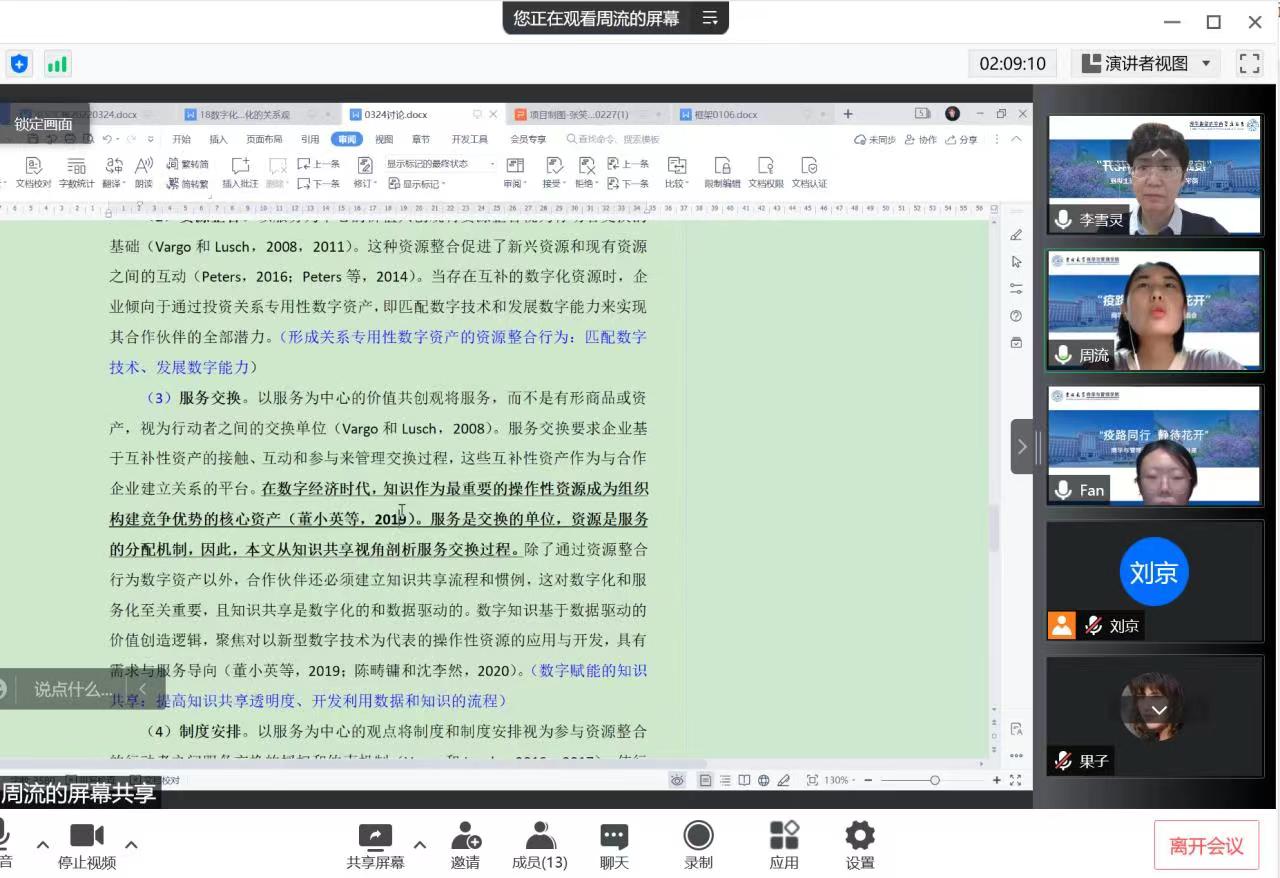 会议开始,2016级博士生刘京以创业者领导力与初创企业战略为主题的学术论文研究和写作思路进行了汇报,2020级博士生刘晶汇报了数字企业价值共创研究的最新进展和框架。随后,李雪灵教授针对每一位学生的汇报从存在问题、解决办法等方面提出意见和建议。参会的成人抖音