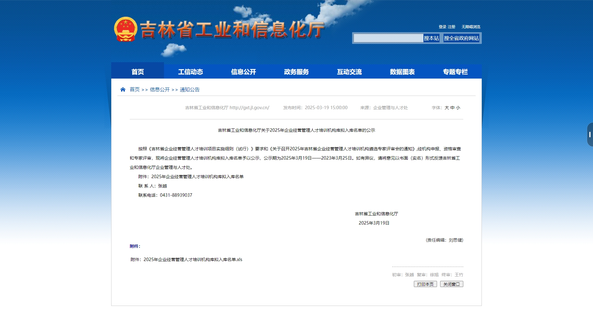 近日,吉林省工业和信息化厅发布了2025年企业经营管理人才培训机构库拟入库名单,成人抖音 凭借雄厚的师资力量、丰富的教学资源和卓越的培训成果,成功入选。
